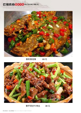 巴湘食府 风情美味 BA XIANG SHI FU 风情美食 品天下 ● 香煎臭桂鱼 68 元 野芹菜炒牛肉丝 38 元 图片仅供参考,出品以实物为准 Photos are for reference only, produced in kind prevail Photos are for reference only, produced in kind prevail 图片仅供参考,出品以实物为准