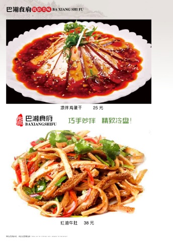 巴湘食府 风情美味 BA XIANG SHI FU 风情美食 品天下 ● 凉拌鸡蛋干 25 元 湘 巴湘食府 巧手妙拌 精致冷盘! BAXIANGSHIFU 红油牛肚 38 元 图片仅供参考,出品以实物为准 Photos are for reference only, produced in kind prevail Photos are for reference only, produced in kind prevail 图片仅供参考,出品以实物为准