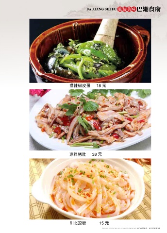 BA XIANG SHI FU 风情美味 巴湘食府 风情美食 品天下 ● 擂辣椒皮蛋 18 元 凉拌猪肚 38 元 川北凉粉 15 元 图片仅供参考,出品以实物为准 Photos are for reference only, produced in kind prevail Photos are for reference only, produced in kind prevail 图片仅供参考,出品以实物为准
