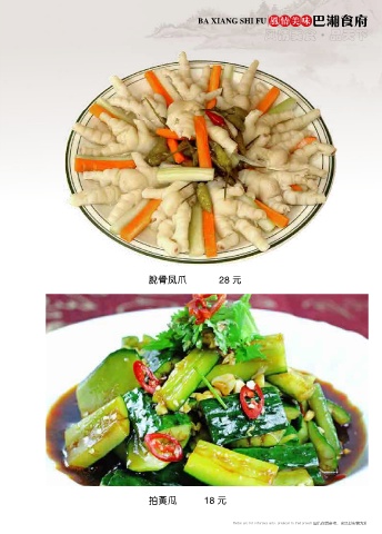 BA XIANG SHI FU 风情美味 巴湘食府 风情美食 品天下 ● 脱骨凤爪 28 元 拍黄瓜 18 元 图片仅供参考,出品以实物为准 Photos are for reference only, produced in kind prevail Photos are for reference only, produced in kind prevail 图片仅供参考,出品以实物为准