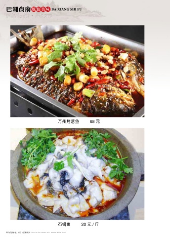 巴湘食府 风情美味 BA XIANG SHI FU 风情美食 品天下 ● 万州烤活鱼 68 元 石锅鱼 20 元 / 斤 图片仅供参考,出品以实物为准 Photos are for reference only, produced in kind prevail Photos are for reference only, produced in kind prevail 图片仅供参考,出品以实物为准