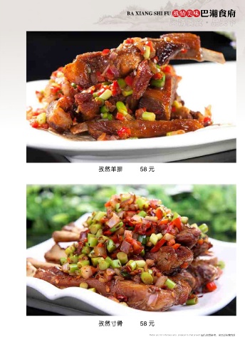 BA XIANG SHI FU 风情美味 巴湘食府 风情美食 品天下 ● 孜然羊排 58 元 孜然寸骨 58 元 图片仅供参考,出品以实物为准 Photos are for reference only, produced in kind prevail Photos are for reference only, produced in kind prevail 图片仅供参考,出品以实物为准