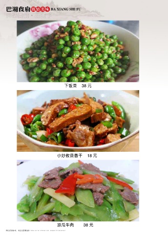 巴湘食府 风情美味 BA XIANG SHI FU 风情美食 品天下 ● 下饭菜 38 元 小炒攸县香干 18 元 凉瓜牛肉 38 元 图片仅供参考,出品以实物为准 Photos are for reference only, produced in kind prevail Photos are for reference only, produced in kind prevail 图片仅供参考,出品以实物为准