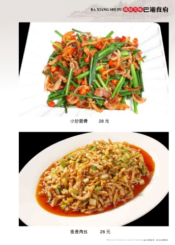 BA XIANG SHI FU 风情美味 巴湘食府 风情美食 品天下 ● 小炒脆骨 28 元 鱼香肉丝 28 元 图片仅供参考,出品以实物为准 Photos are for reference only, produced in kind prevail Photos are for reference only, produced in kind prevail 图片仅供参考,出品以实物为准