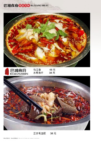 巴湘食府 风情美味 BA XIANG SHI FU 风情美食 品天下 ● 湘 巴湘食府 乌江鱼 48 元 水煮鱼片 38 元 BAXIANGSHIFU 正宗毛血旺 38 元 图片仅供参考,出品以实物为准 Photos are for reference only, produced in kind prevail Photos are for reference only, produced in kind prevail 图片仅供参考,出品以实物为准