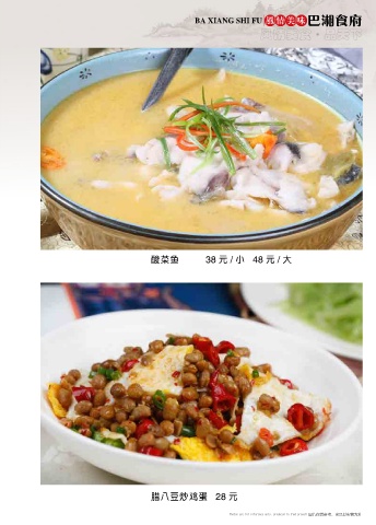 BA XIANG SHI FU 风情美味 巴湘食府 风情美食 品天下 ● 酸菜鱼 38 元 / 小 48 元 / 大 腊八豆炒鸡蛋 28 元 图片仅供参考,出品以实物为准 Photos are for reference only, produced in kind prevail Photos are for reference only, produced in kind prevail 图片仅供参考,出品以实物为准