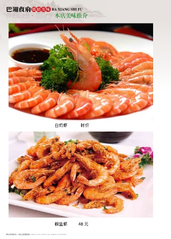 巴湘食府 风情美味 BA XIANG SHI FU 风情美食 品天下 本店美味推介 ● 白灼虾 时价 椒盐虾 48 元 图片仅供参考,出品以实物为准 Photos are for reference only, produced in kind prevail Photos are for reference only, produced in kind prevail 图片仅供参考,出品以实物为准