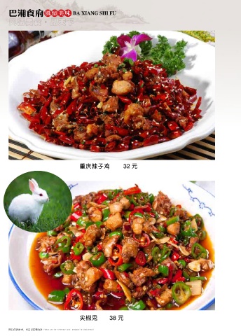 巴湘食府 风情美味 BA XIANG SHI FU 风情美食 品天下 ● 重庆辣子鸡 32 元 尖椒兔 38 元 图片仅供参考,出品以实物为准 Photos are for reference only, produced in kind prevail Photos are for reference only, produced in kind prevail 图片仅供参考,出品以实物为准