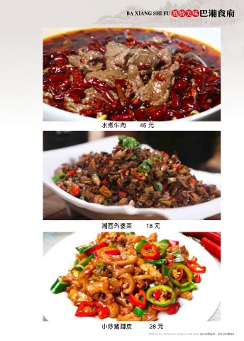 BA XIANG SHI FU 风情美味 巴湘食府 风情美食 品天下 ● 水煮牛肉 45 元 湘西外婆菜 18 元 小炒猪脚皮 28 元 图片仅供参考,出品以实物为准 Photos are for reference only, produced in kind prevail Photos are for reference only, produced in kind prevail 图片仅供参考,出品以实物为准