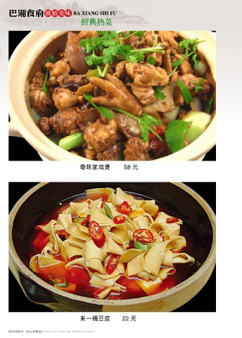巴湘食府 风情美味 BA XIANG SHI FU 风情美食 品天下 经典热菜 ● 奇味家鸡煲 58 元 来一桶豆皮 22 元 图片仅供参考,出品以实物为准 Photos are for reference only, produced in kind prevail Photos are for reference only, produced in kind prevail 图片仅供参考,出品以实物为准