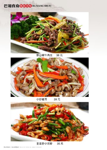 巴湘食府 风情美味 BA XIANG SHI FU 风情美食 品天下 ● 野山椒牛肉丝 38 元 小炒猪耳 28 元 韭菜炒小河虾 35 元 图片仅供参考,出品以实物为准 Photos are for reference only, produced in kind prevail Photos are for reference only, produced in kind prevail 图片仅供参考,出品以实物为准