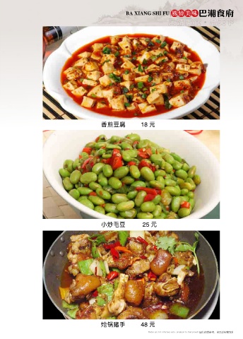BA XIANG SHI FU 风情美味 巴湘食府 风情美食 品天下 ● 香煎豆腐 18 元 小炒毛豆 25 元 炝锅猪手 48 元 图片仅供参考,出品以实物为准 Photos are for reference only, produced in kind prevail Photos are for reference only, produced in kind prevail 图片仅供参考,出品以实物为准