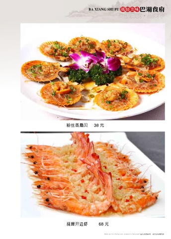 BA XIANG SHI FU 风情美味 巴湘食府 风情美食 品天下 ● 粉丝蒸扇贝 38 元 蒜茸开边虾 68 元 图片仅供参考,出品以实物为准 Photos are for reference only, produced in kind prevail Photos are for reference only, produced in kind prevail 图片仅供参考,出品以实物为准