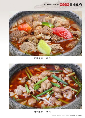 BA XIANG SHI FU 风情美味 巴湘食府 风情美食 品天下 ● 石锅牛腩 48 元 石锅肥肠 48 元 图片仅供参考,出品以实物为准 Photos are for reference only, produced in kind prevail Photos are for reference only, produced in kind prevail 图片仅供参考,出品以实物为准