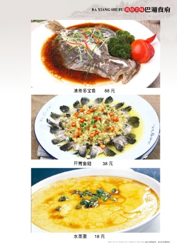 BA XIANG SHI FU 风情美味 巴湘食府 风情美食 品天下 ● 清蒸多宝鱼 88 元 开胃鱼翅 38 元 水蒸蛋 18 元 图片仅供参考,出品以实物为准 Photos are for reference only, produced in kind prevail Photos are for reference only, produced in kind prevail 图片仅供参考,出品以实物为准
