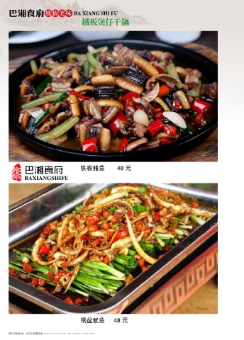 巴湘食府 风情美味 BA XIANG SHI FU 风情美食 品天下 铁板煲仔干锅 ● 湘 巴湘食府 铁板鳝鱼 48 元 BAXIANGSHIFU 钢盆鱿鱼 48 元 图片仅供参考,出品以实物为准 Photos are for reference only, produced in kind prevail Photos are for reference only, produced in kind prevail 图片仅供参考,出品以实物为准