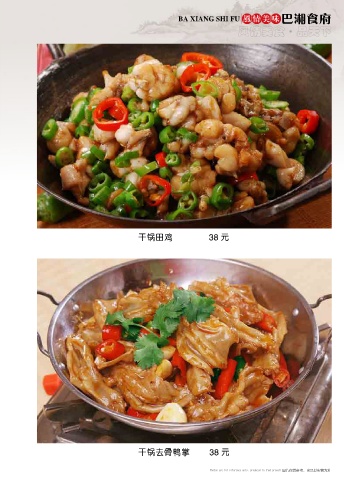 BA XIANG SHI FU 风情美味 巴湘食府 风情美食 品天下 ● 干锅田鸡 38 元 干锅去骨鸭掌 38 元 图片仅供参考,出品以实物为准 Photos are for reference only, produced in kind prevail Photos are for reference only, produced in kind prevail 图片仅供参考,出品以实物为准