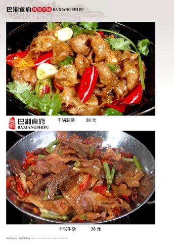 巴湘食府 风情美味 BA XIANG SHI FU 风情美食 品天下 ● 湘 巴湘食府 干锅肥肠 38 元 BAXIANGSHIFU 干锅牛杂 38 元 图片仅供参考,出品以实物为准 Photos are for reference only, produced in kind prevail Photos are for reference only, produced in kind prevail 图片仅供参考,出品以实物为准