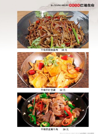 BA XIANG SHI FU 风情美味 巴湘食府 风情美食 品天下 ● 干锅茶树菇腊肉 38 元 干锅千叶豆腐 32 元 干锅带皮黄牛肉 38 元 图片仅供参考,出品以实物为准 Photos are for reference only, produced in kind prevail Photos are for reference only, produced in kind prevail 图片仅供参考,出品以实物为准