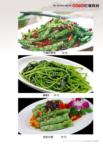 BA XIANG SHI FU 风情美味 巴湘食府 风情美食 品天下 ● 干煸四季豆 18 元 番薯叶 20 元 虎皮尖椒 18 元 图片仅供参考,出品以实物为准 Photos are for reference only, produced in kind prevail Photos are for reference only, produced in kind prevail 图片仅供参考,出品以实物为准