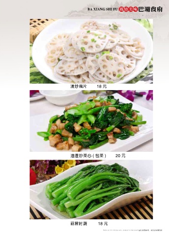 BA XIANG SHI FU 风情美味 巴湘食府 风情美食 品天下 ● 清炒藕片 18 元 油渣炒菜心 ( 包菜 ) 20 元 蒜茸时蔬 18 元 图片仅供参考,出品以实物为准 Photos are for reference only, produced in kind prevail Photos are for reference only, produced in kind prevail 图片仅供参考,出品以实物为准