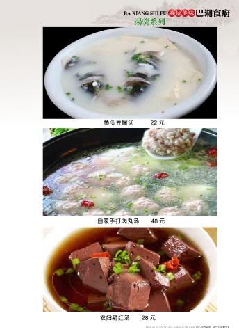 BA XIANG SHI FU 风情美味 巴湘食府 汤羹系列 风情美食 品天下 ● 鱼头豆腐汤 22 元 自家手打肉丸汤 48 元 农妇猪红汤 28 元 图片仅供参考,出品以实物为准 Photos are for reference only, produced in kind prevail Photos are for reference only, produced in kind prevail 图片仅供参考,出品以实物为准