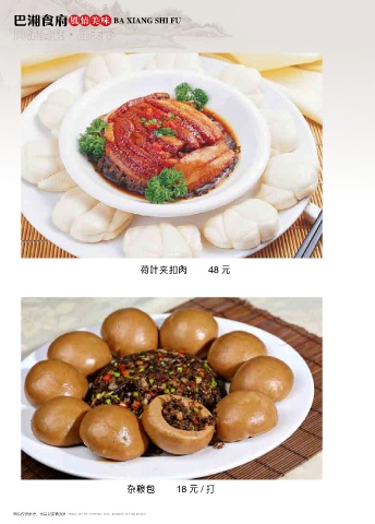 巴湘食府 风情美味 BA XIANG SHI FU 风情美食 品天下 ● 荷叶夹扣肉 48 元 杂粮包 18 元 / 打 图片仅供参考,出品以实物为准 Photos are for reference only, produced in kind prevail Photos are for reference only, produced in kind prevail 图片仅供参考,出品以实物为准