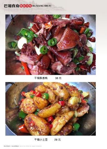 巴湘食府 风情美味 BA XIANG SHI FU 风情美食 品天下 ● 干锅飘香鸭 38 元 干锅小土豆 28 元 图片仅供参考,出品以实物为准 Photos are for reference only, produced in kind prevail Photos are for reference only, produced in kind prevail 图片仅供参考,出品以实物为准