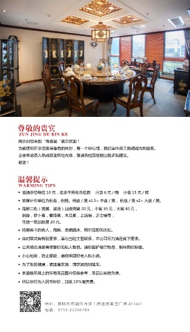 持贵宾卡的客人,海鲜、香烟酒水、特价品恕无折扣。