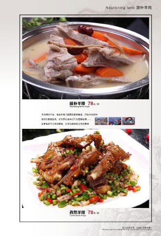 Nourishing lamb 滋补羊肉 滋补羊排 78元/份 Nourishing lamb chops 不知何时开始,有些厌倦了喧嚣热爱美食者,开始寻找那种 独特的美食佳肴,还有那份流失已久的恬静心情 ...... 这里包含了太多的隐秘、太多的诱惑和太多的期待 孜然羊排 78元/份 Cumin lamb chops 图片仅供参考,出品以实物为准 ! Photos are for reference only, produced in kind prevail