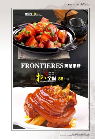 Hot dishes 热菜小炒 红烧肉 45元/份 Braised Pig Feet in Brown Sauce FRONTIERES 热菜小炒 扒 全肘 传统手艺 进店必点 DONGBEIPAQUANZHOU 88 元/份 图片仅供参考,出品以实物为准 ! Photos are for reference only, produced in kind prevail