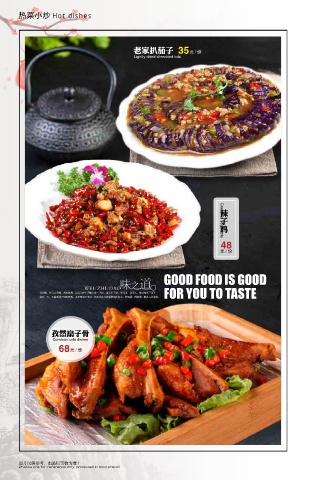 热菜小炒 Hot dishes 老家扒茄子 35元/份 Lightly dried shredded tofu 辣子鸡 Grandma vegetable 48 元/份 GOOD FOOD IS GOOD FOR YOU TO TASTE 孜然扇子骨 Common cold dishes 68元/份 图片仅供参考,出品以实物为准 ! Photos are for reference only, produced in kind prevail
