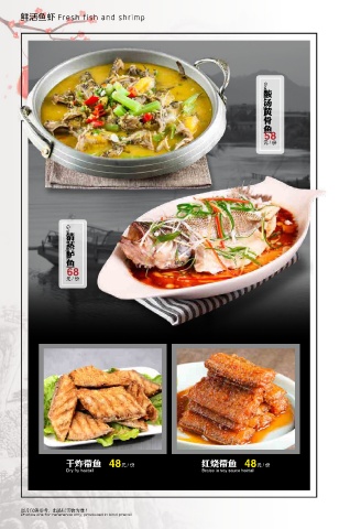 鲜活鱼虾 Fresh fish and shrimp 酸汤黄骨鱼 Grandma vegetable 58 元/份 清蒸鲈鱼 Grandma vegetable 68 元/份 干炸带鱼 48元/份 红烧带鱼 48元/份 Dry fry hairtail Braise in soy sauce hairtail 图片仅供参考,出品以实物为准 ! Photos are for reference only, produced in kind prevail