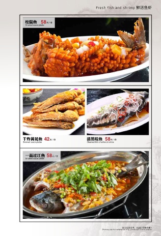 Fresh fish and shrimp 鲜活鱼虾 松鼠鱼 58元/份 Smoked sauce platter 干炸黄花鱼 42元/份 清蒸皖鱼 58元/份 Smoked sauce platter Steamed fish of anhui province 一品过江鱼 58元/份 Smoked sauce platter 图片仅供参考,出品以实物为准 ! Photos are for reference only, produced in kind prevail