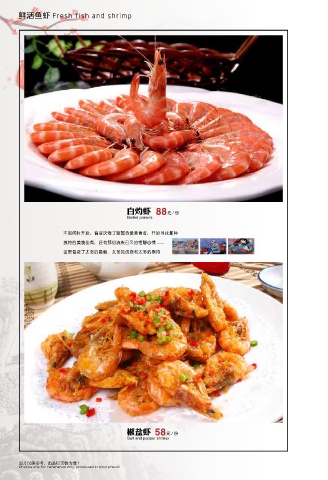 鲜活鱼虾 Fresh fish and shrimp 白灼虾 88元/份 Boiled prawns 不知何时开始,有些厌倦了喧嚣热爱美食者,开始寻找那种 独特的美食佳肴,还有那份流失已久的恬静心情 ...... 这里包含了太多的隐秘、太多的诱惑和太多的期待 椒盐虾 58元/份 Salt and pepper shrimp 图片仅供参考,出品以实物为准 ! Photos are for reference only, produced in kind prevail