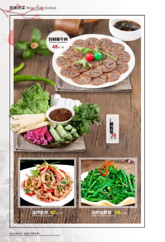 精美凉菜 Nice cold dishes 自制酱牛肉 Common cold dishes 48元/份 蘸酱菜 Dip in pickles 38 元/份 凉拌肚丝 42元/份 凉拌山野菜 28元/份 Dongbei dipping pickles Salad with wild vegetables 图片仅供参考,出品以实物为准 ! Photos are for reference only, produced in kind prevail